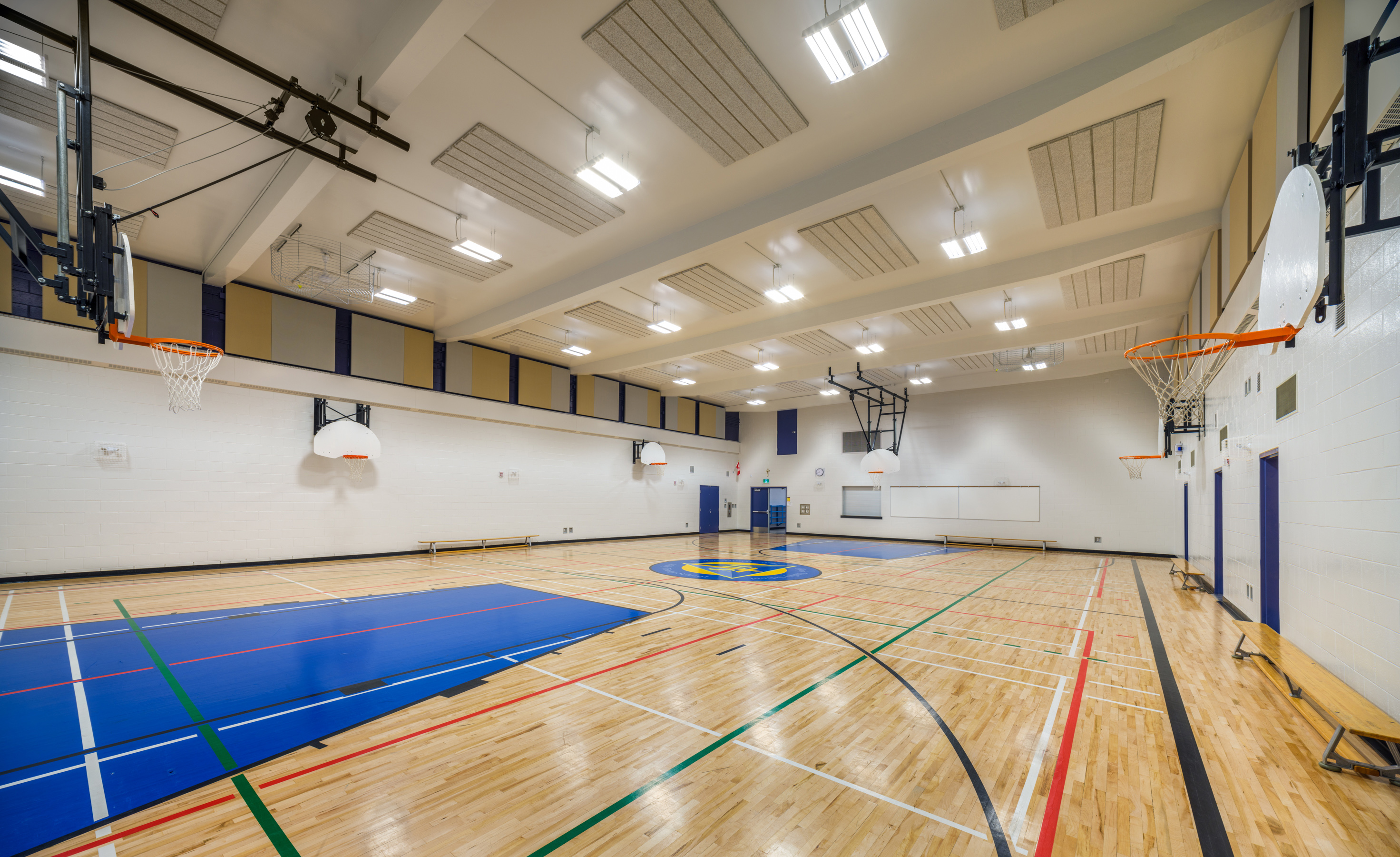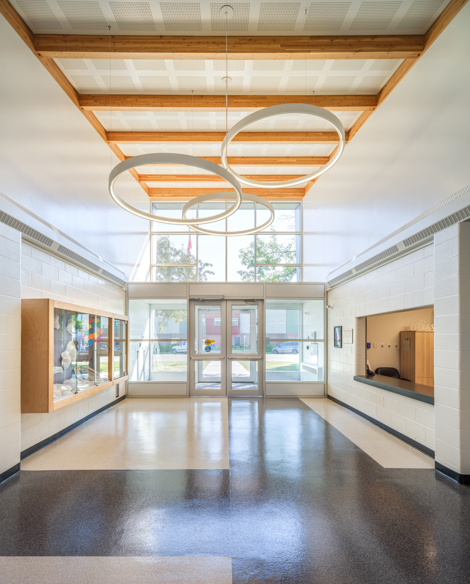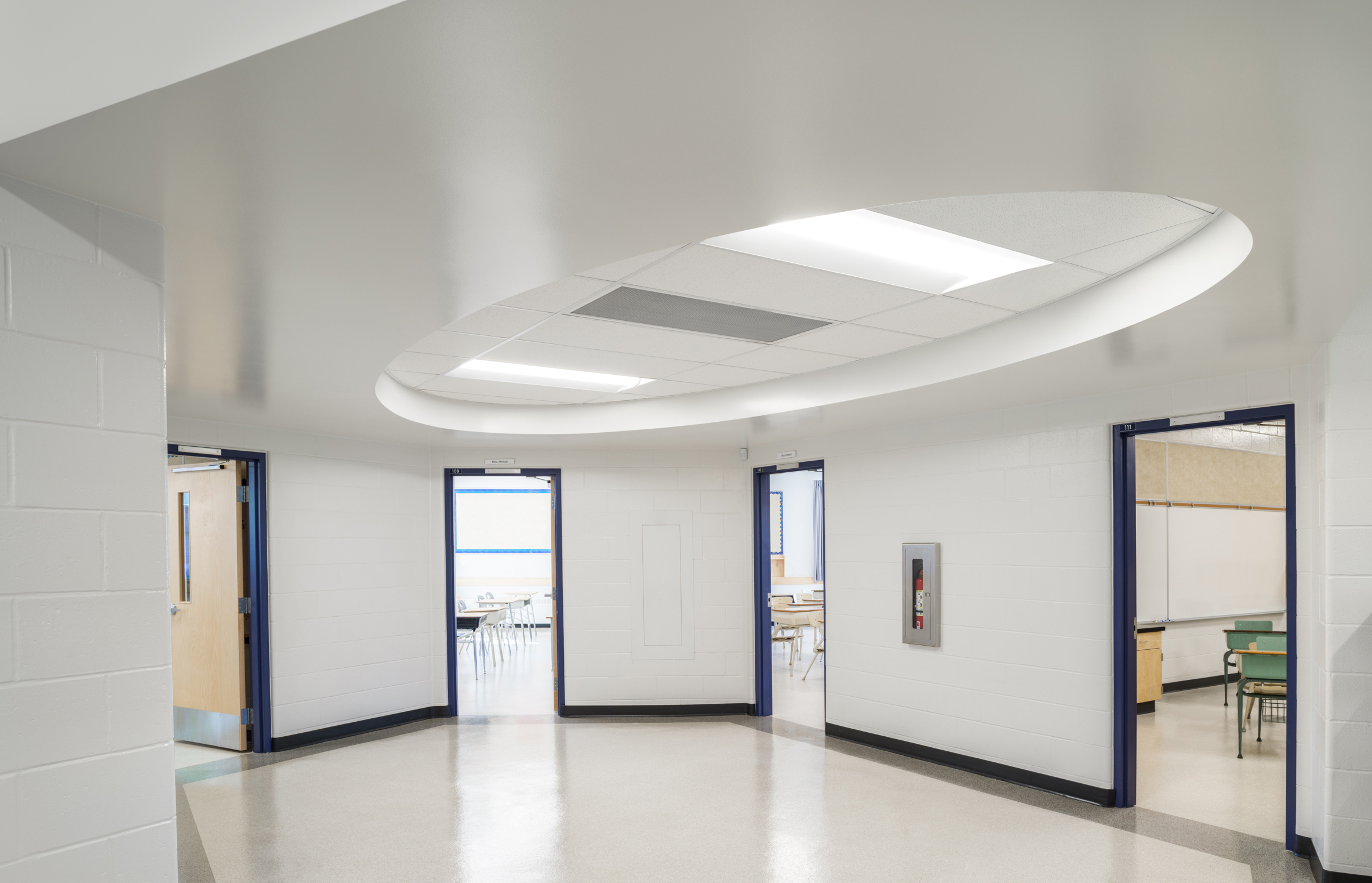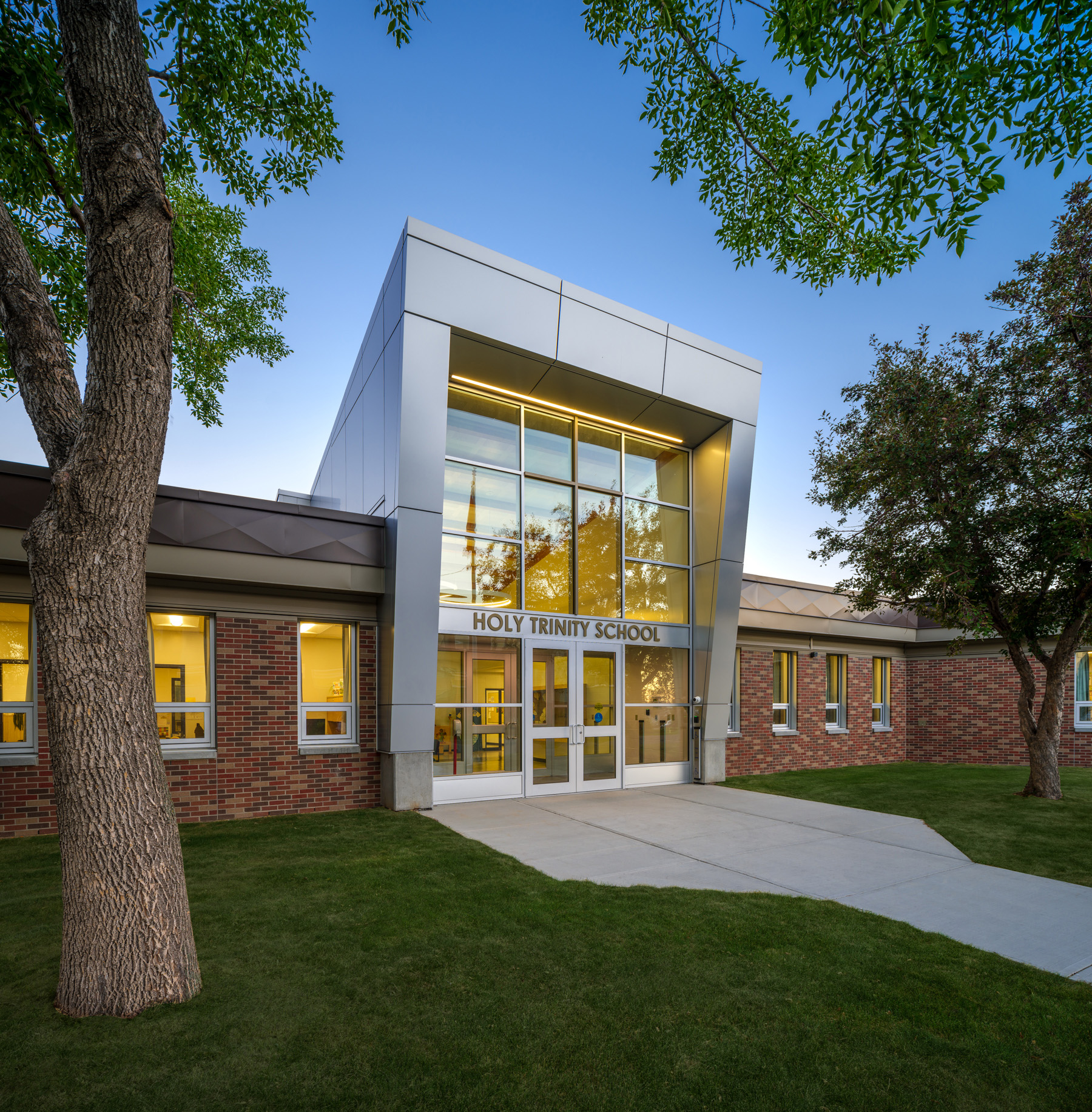 The Holy Trinity School modernization involved the complete redesign and rebuild of the existing school from the inside out. The big challenges for this small school were bringing more natural light into the center of the building, working around the existing structure, and bringing the building up to existing codes. The Architect added a great new entrance that brought light into the space, and SMP helped brighten up the vestibule with new LED ring lights and linear lights. We also provided all new lighting and controls throughout the school.