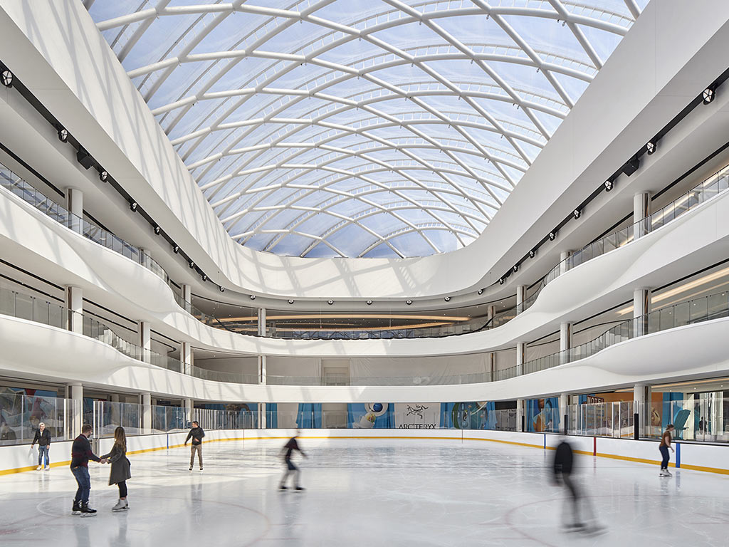 Constructed overtop of an interstate highway, the 550,000 ft2 Connector building features four floors of high-end retail space, a food court, and a full NHL-regulation sized ice rink. The rink also features a full theatrical lighting setup that will allow the space to serve as a concert venue.