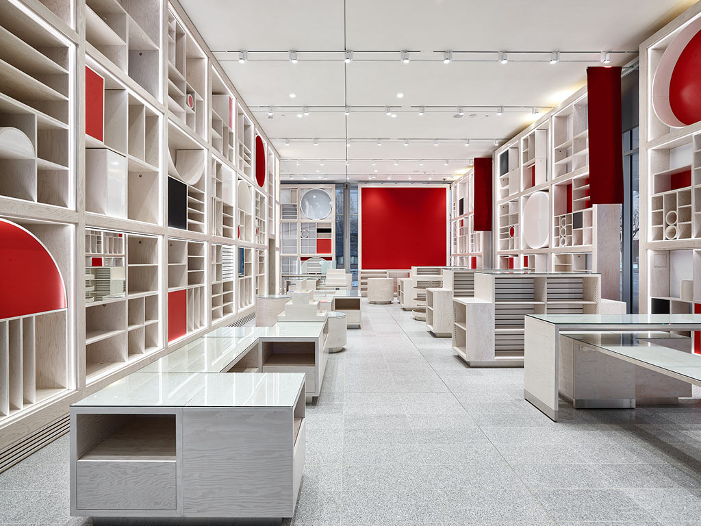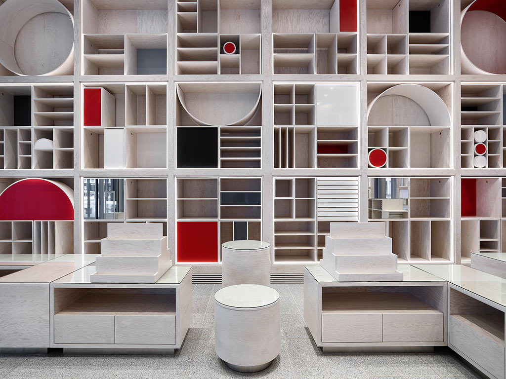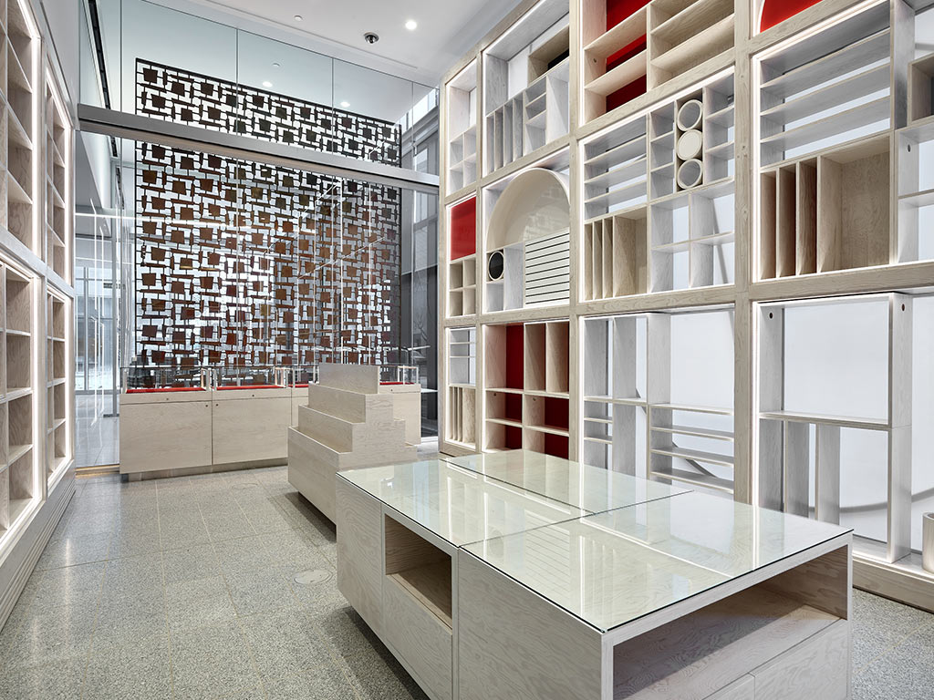 The gift shop in the new Royal Alberta Museum offers visitors a means of extending their museum experience and taking home a souvenir of their visit. Inspired by antique museum specimen trays and mosaic panels that previously adorned the building, the interior design is a modern merchandising system allowing endless display combinations. A palate of whitewashed plywood was used with a compliment of colors and finishes that allow the retail team to play and evolve the store over time.