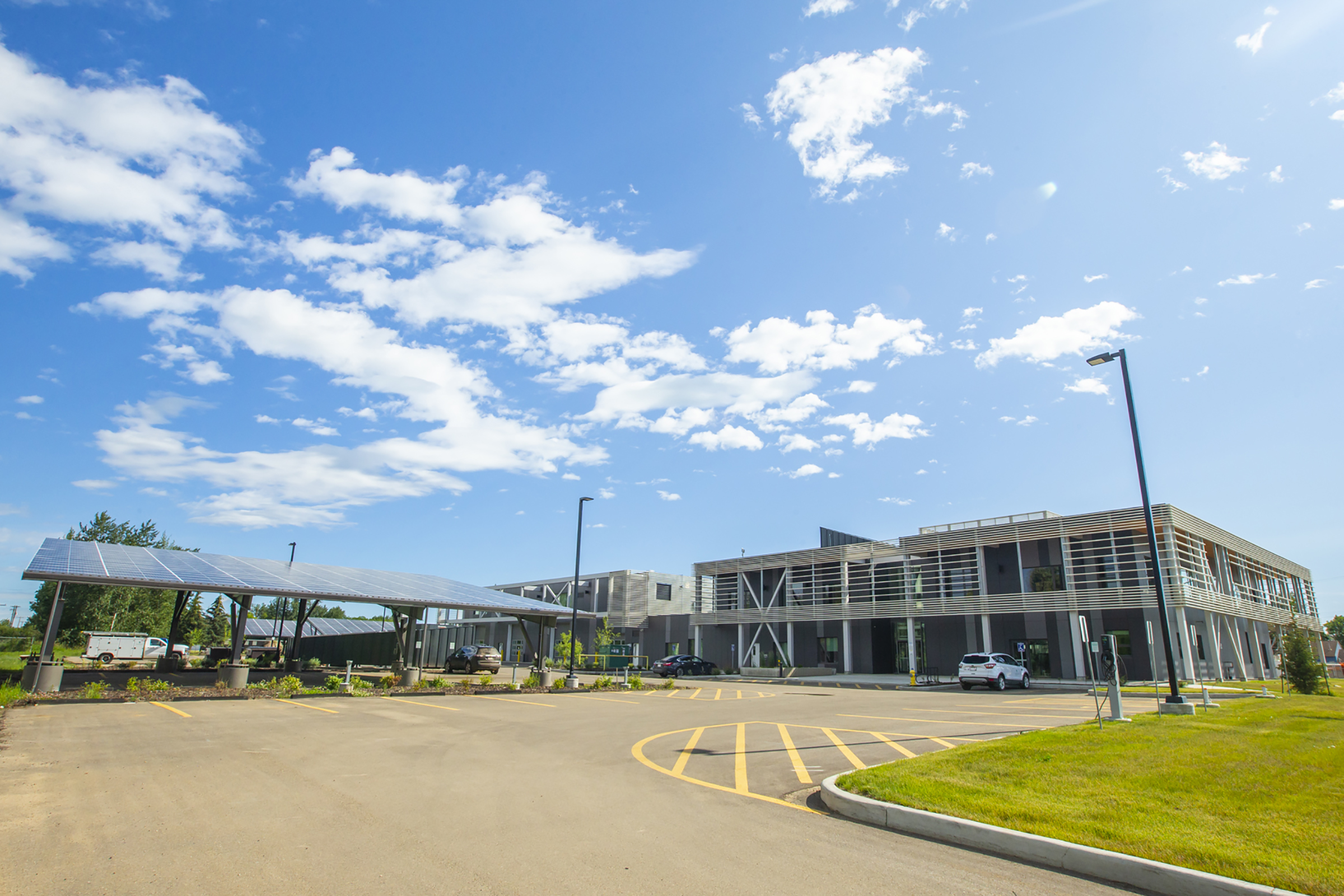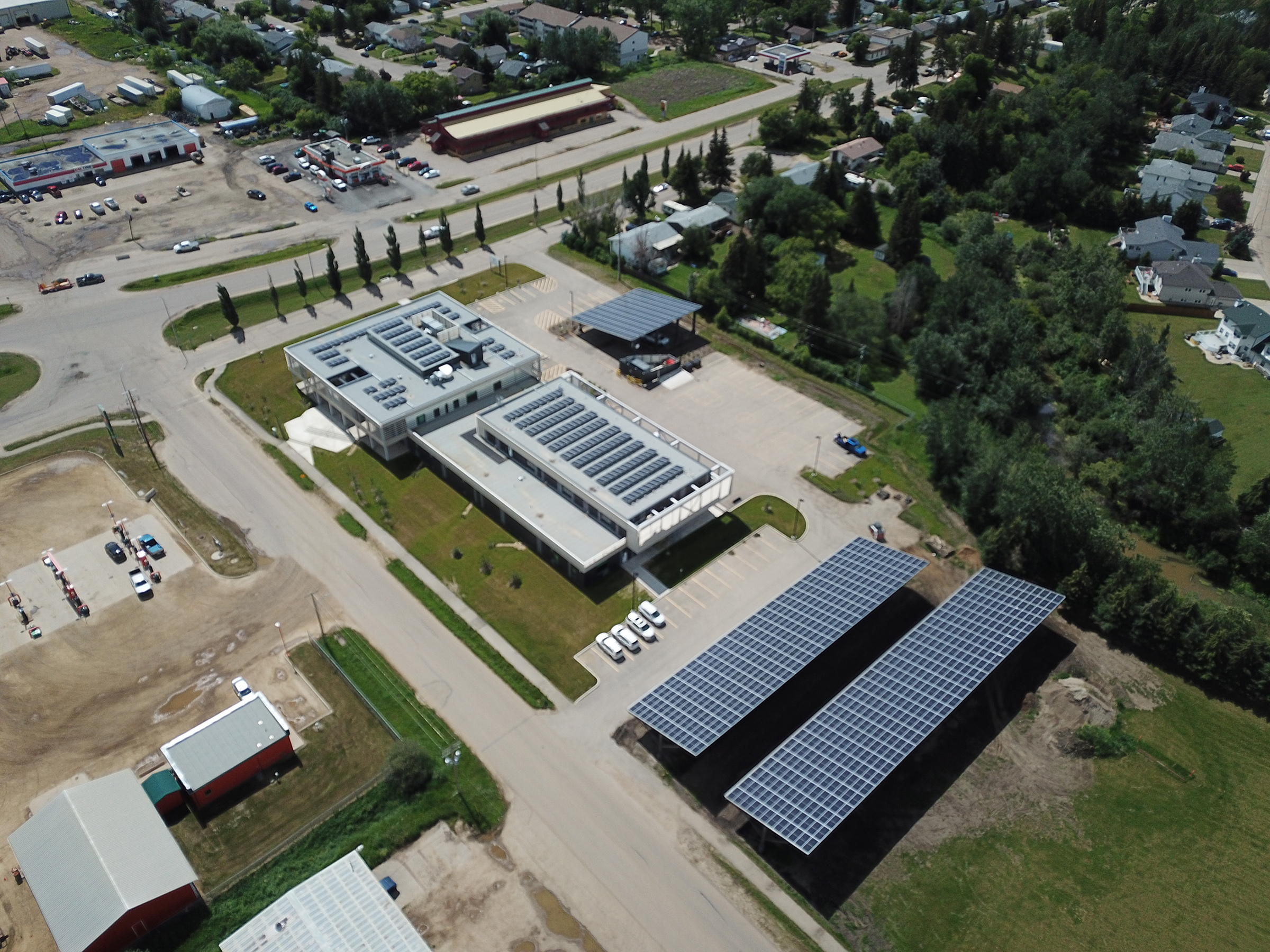 The new High Prairie Campus (HPC) Northern Lakes College (NLC) post-secondary facility was designed to achieve LEED® Silver certification and boasts an array of sustainable features, including an extensive underground geothermal installation, as well as LED lighting and controls. The College worked diligently to secure funding to enable the new facility to become fully NetZero (energy), which was achieved through the installation of a large photovoltaic (PV) system.