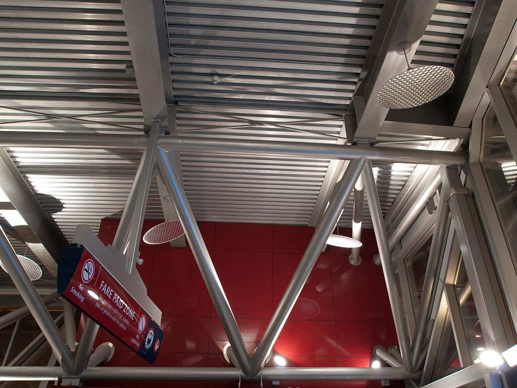 The aesthetic appeal of the new station required an integrated lighting design to accentuate the architectural design and features of the building and exterior. Interior lighting design had to allow for maintenance of all lighting from a maximum of 12 feet in a high volume space with 90% glass-contained wall. Lighting fixtures were incorporated into the structure and located in inconspicuous locations so as to respect the architecture. Transit platforms incorporated indirect lighting fixtures, similar to the indoor building, to provide a seamless transition to and from the station. Ceramic metal-halide lamp sources were utilized for all interior and exterior fixtures.