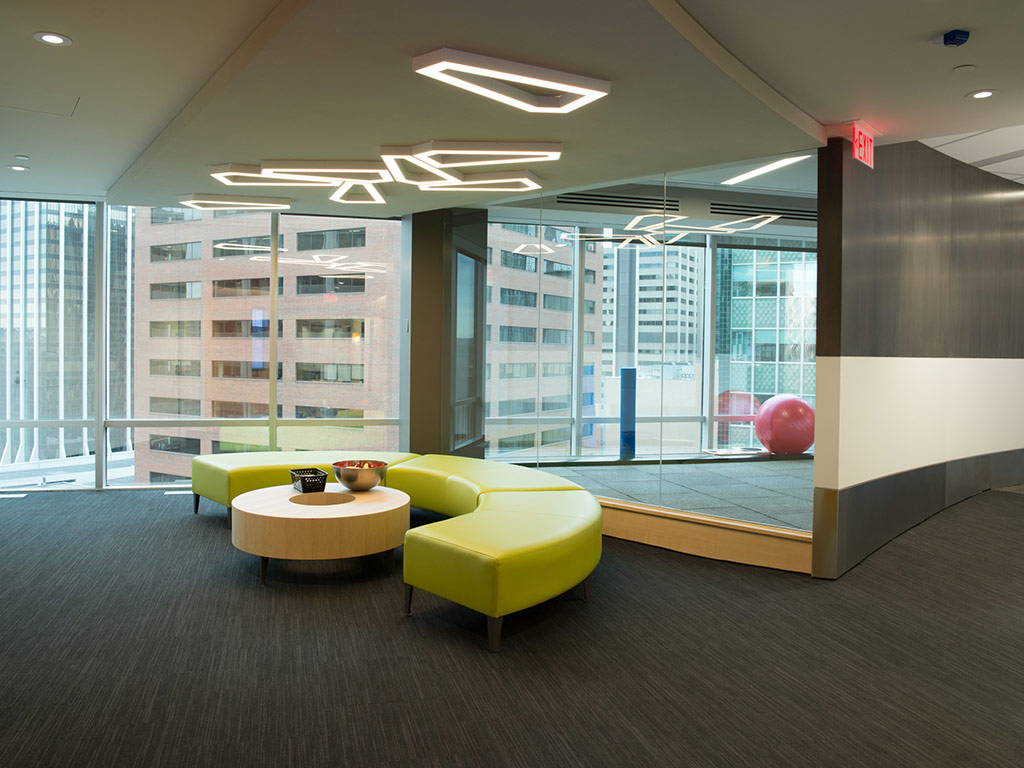 Nexen Wellness Centre supports the health and well-being of its members through creating an environment that promotes personal success, and providing innovative health and wellness programs. The challenge was to use energy efficient luminaires and controls while maintaining the maintenance and budget criteria — both were met. Angular surface LED custom luminaires were designed as artwork of angular metals and opal acrylic with remote drivers.